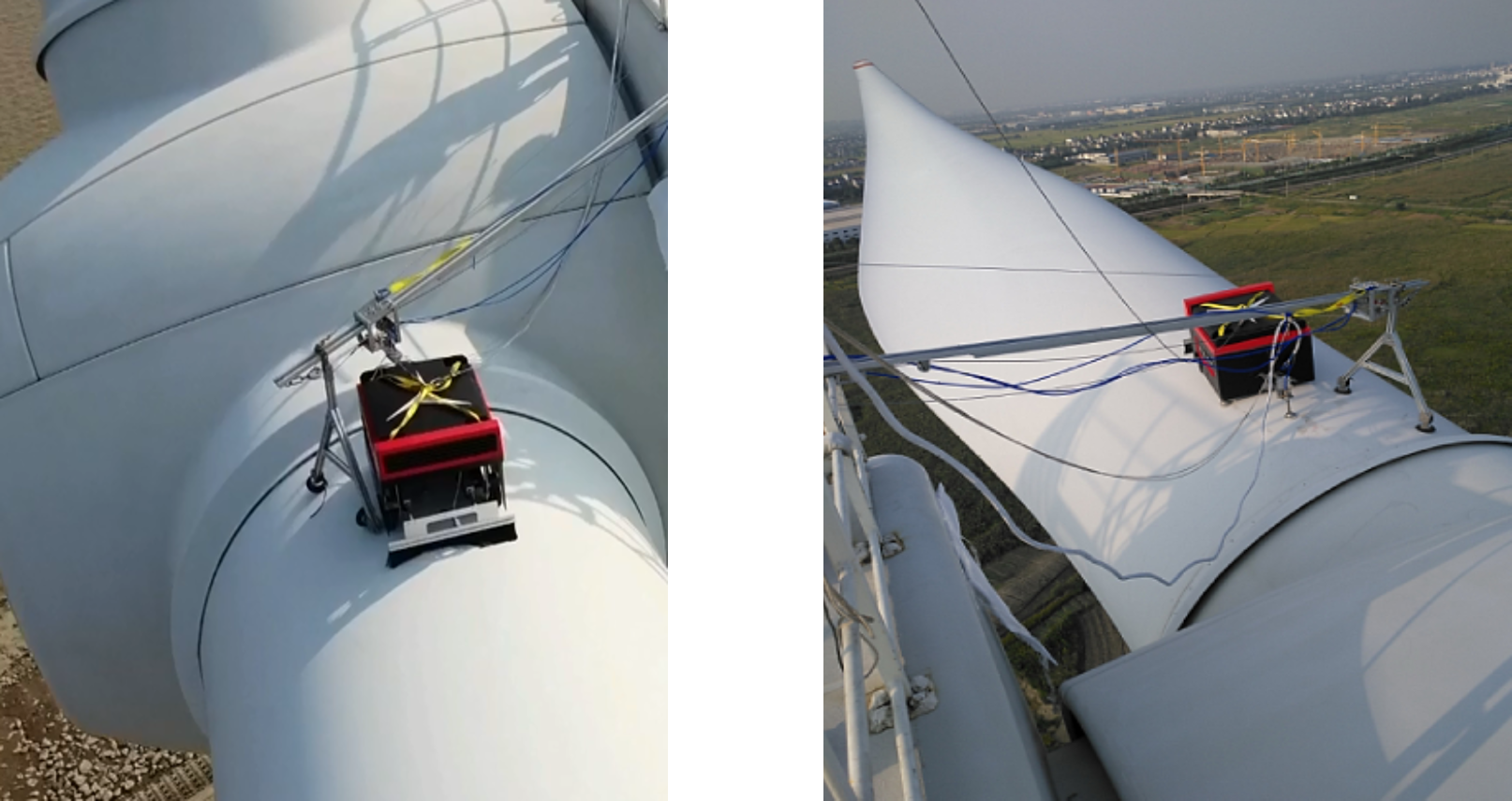 该款机器人主要用于风力发电场中的叶片在线检测巡检。传统人工叶片巡检操作方式具有诸多局限,已无法适应新形势下风机运维模式的发展。并且,采用智能化检测手段将比传统人工方式作业效率有极大提高,开展智能机器人代替人工进行叶片损伤检测避免了高空作业的危险源。